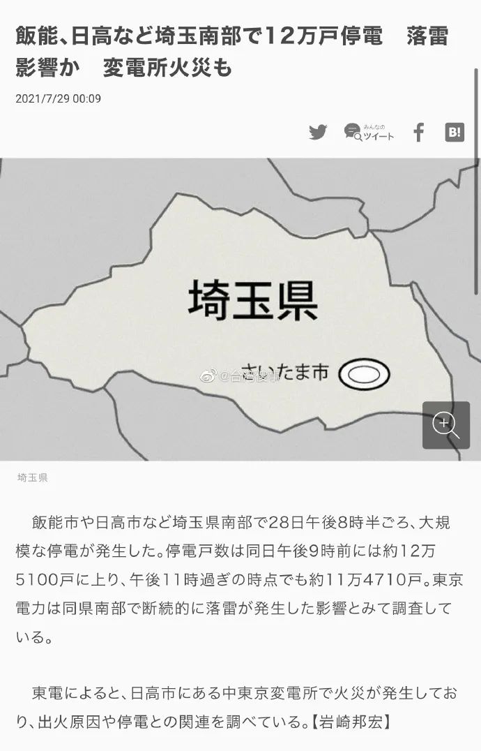 巧合吧,當晚東京圈的埼玉縣,變電站似乎是被雷劈了,火災,超過12萬户停電。