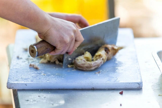 因此,每個家庭都必須要能剁肉,用重又大的中國菜刀切肉塊,同時把大刀橫放,把肉塊切開,把骨頭敲碎,處理家禽。以中國人最喜歡的烤鴨為例,殺一隻鴨子必須粉碎骨頭,要用很重的菜刀,用全身的力量來處理。像日本和西洋的菜刀是無法處理這種肉類的。