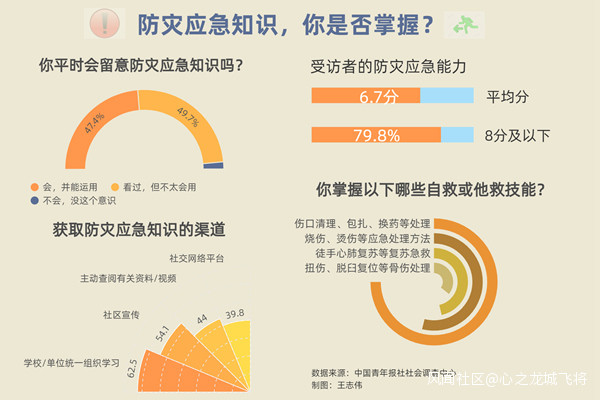 調查顯示,47.4%受訪者表示平時會留意各種防災應急知識,並能運用。也有49.7%受訪者表示看過,但不太會用。2.9%受訪者表示不會留意,沒這個意識。