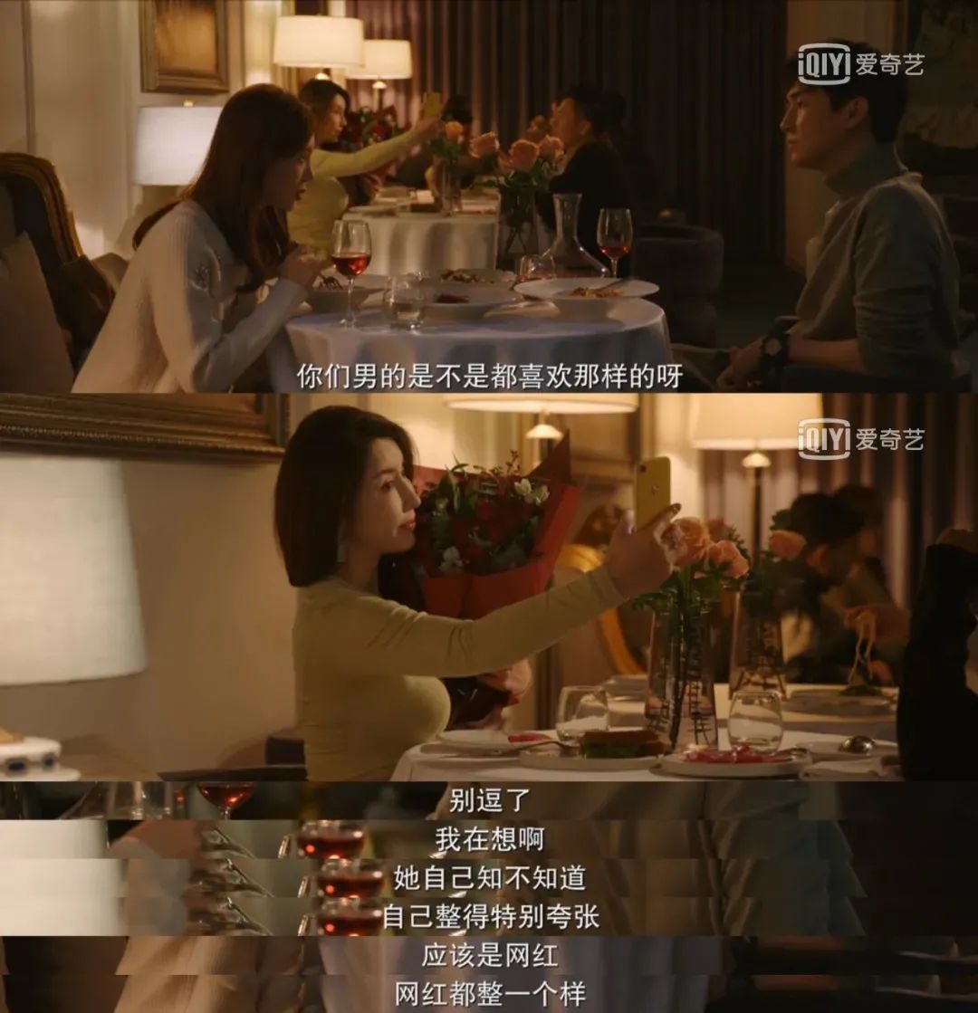 女性角色也瘋狂自爆厭女,看有姑娘在高級餐廳自拍,金晨陰陽道:“你們男人是不是都喜歡那樣的?”