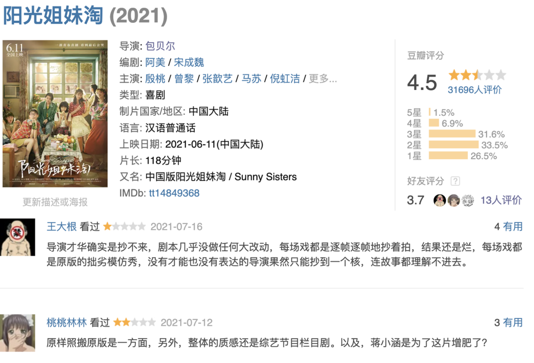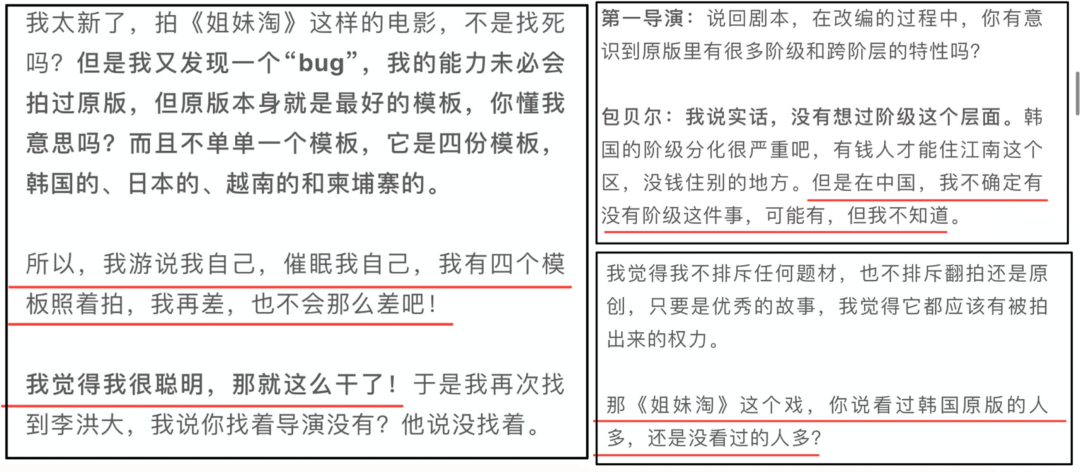 第一導演採訪他,發現這人既不瞭解女性,也不認為中國存在階級,電影就是韓國原版的逐幀翻拍,不知意義何在。