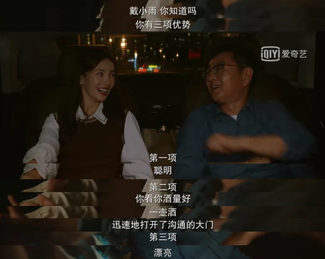 王珞丹一出場就展現了自己左右逢源、長袖善舞的江湖氣,捧男人,賞美人,裏子還是藉着美人誇男人。