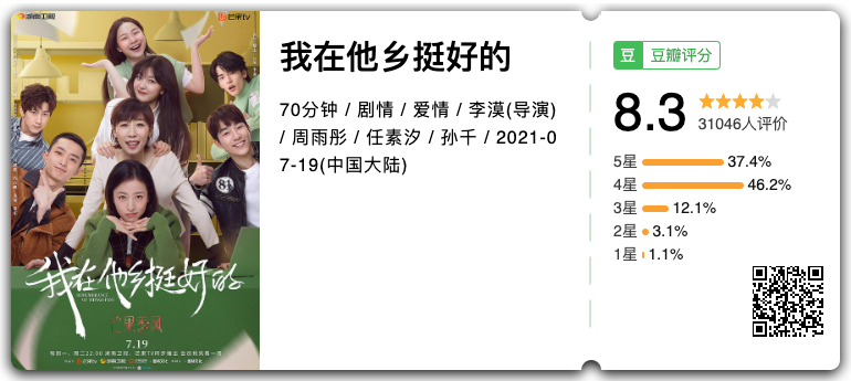 前一部劇叫《我在他鄉挺好的》,豆瓣評分8.3,無流量無大導演護航,最有名的演員是任素汐和周雨彤。