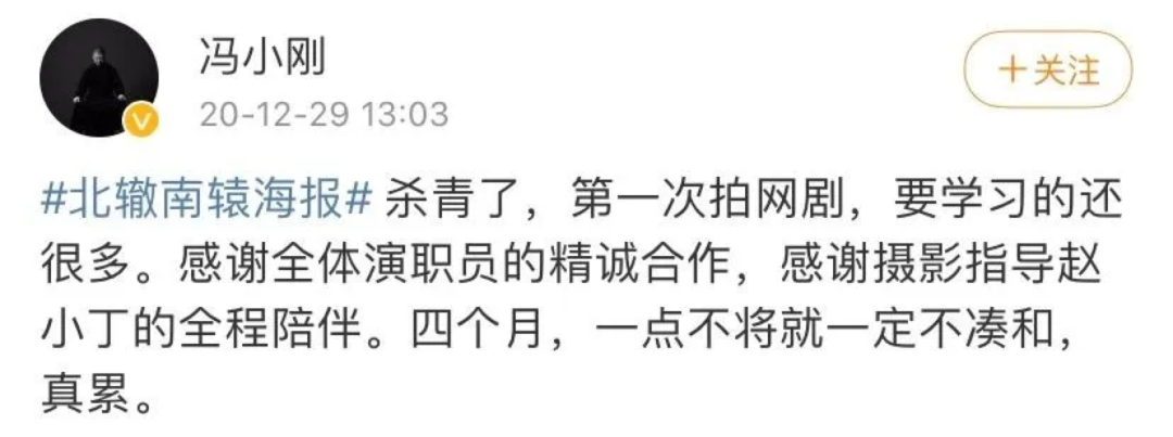 一年後馮氏女性劇成了,只見導演在微博上放言,“四個月,一點不將就,一定不湊合”。