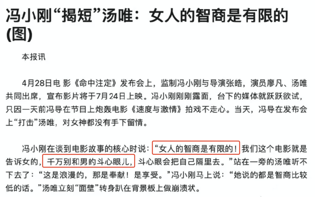 《命中註定》發佈會上,監製馮小剛當着湯唯的面,揚言道“女人的智商是有限的”,並且深以為然。