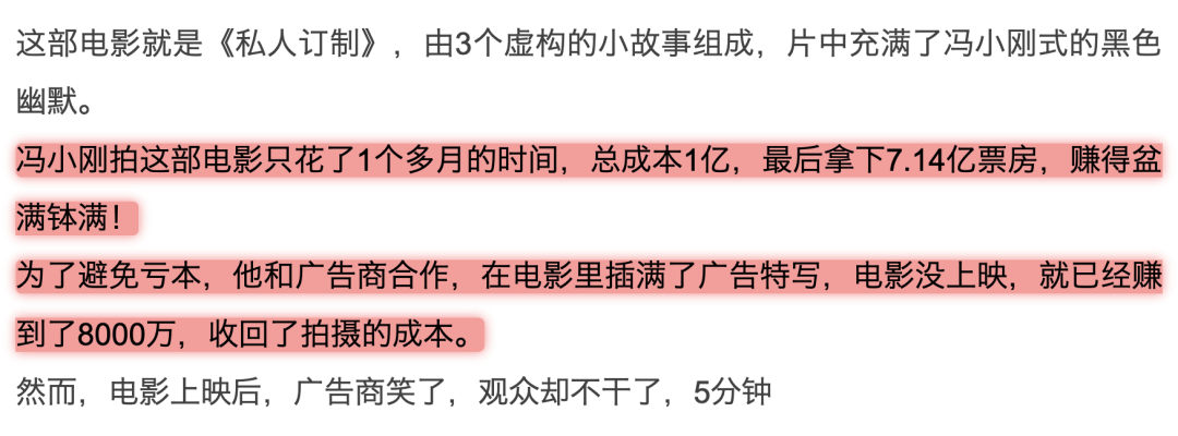 當年《一九四二》票房撲街,公司直虧2個多億,馮小剛花一個月拍完電影《私人訂製》,1億成本拿下7.14億票房。