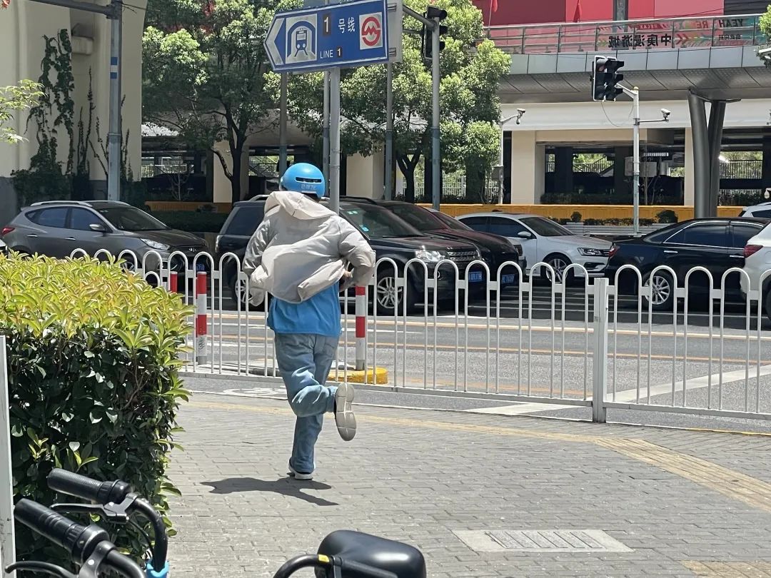 頭戴安全帽、臉上蒙着防曬巾、脖上掛着毛巾、胳膊套着防曬袖……這是高温天氣下外賣小哥的標配,儘管如此,他們還是被曬得黝黑。