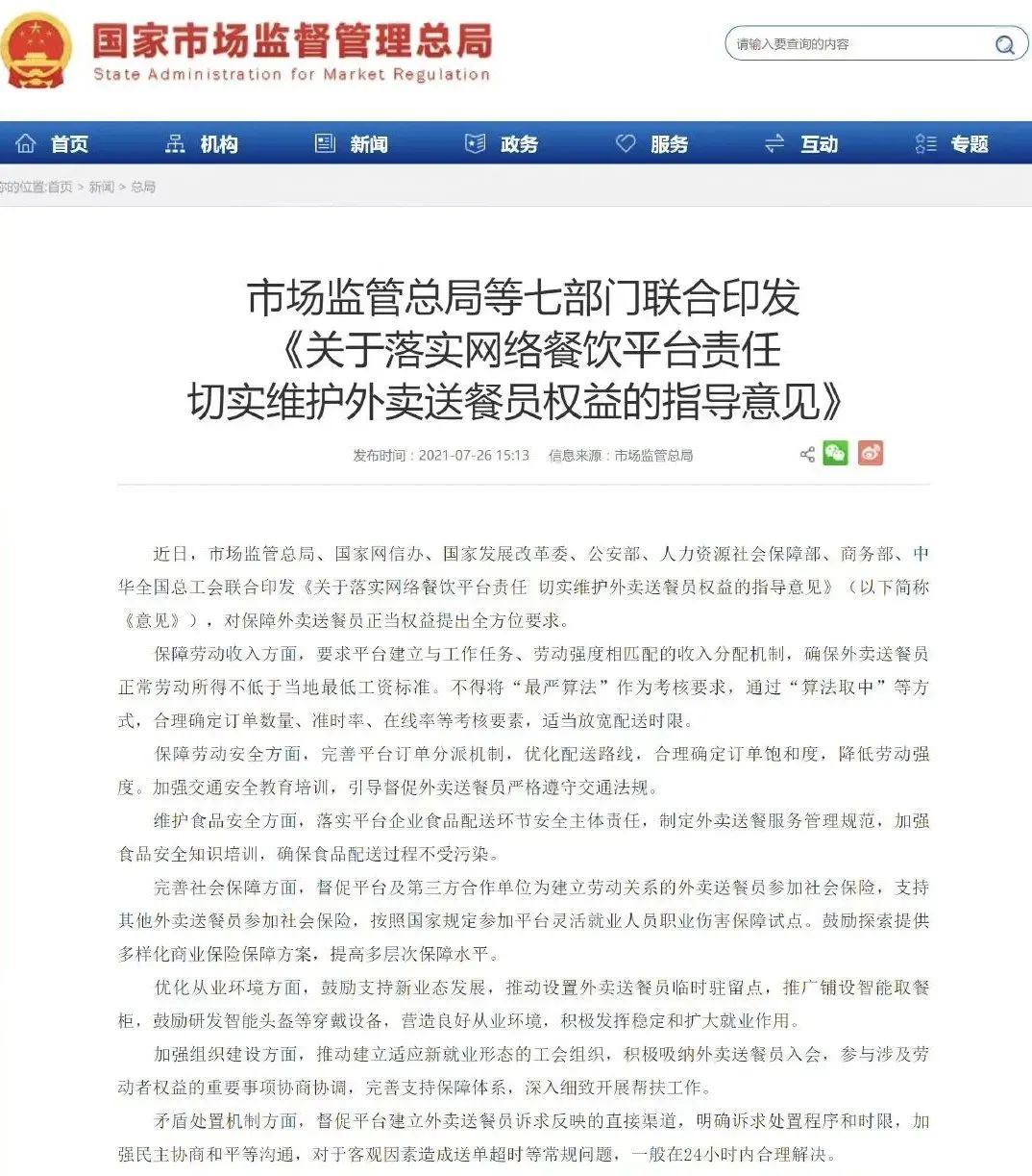 7月26日,市場監管總局、國家網信辦、國家發展改革委、公安部、人力資源社會保障部、商務部、中華全國總工會聯合印發《關於落實網絡餐飲平台責任 切實維護外賣送餐員權益的指導意見》(以下簡稱《意見》),對保障外賣送餐員正當權益提出全方位要求,特別是,督促平台及第三方合作單位為建立勞動關係的外賣送餐員參加社保。