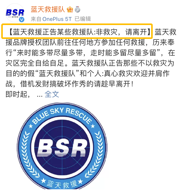 那些在災區讓志願者給他們讓路的網紅們不知道,藍天救援隊一直提供的是免費救援,且不接受提出附加條件的企業贊助。
