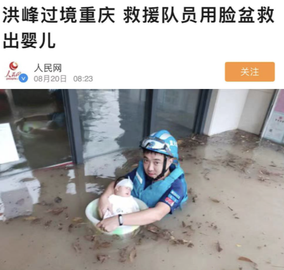 在重慶洪水爆發的時候,藍天救援隊也是衝在第一線,一張用臉盆救出嬰兒的照片感動無數人。