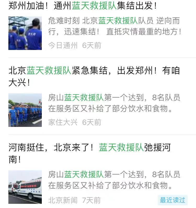 災情發生當天,北京藍天救援隊迅速行動,33車93人午夜就抵達鄭州,第二天就轉移受災民眾13300多人。