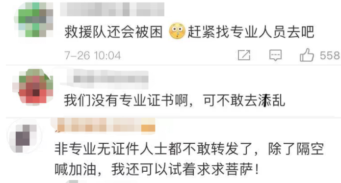 網友陰陽怪氣的説“救援隊還會被困,找專業人士吧”、“只能替你們求求菩薩”、“我沒有證書,可不敢去添亂”等。