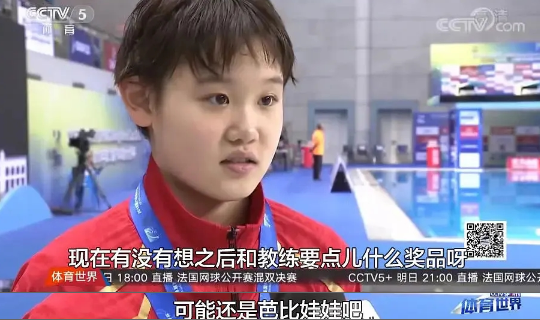 “還沒想好向教練要點什麼禮物,應該是芭比娃娃吧,因為我比較喜歡,不開心的時候,它們可以和我做伴,我可以和它們説説話!”