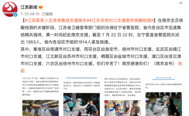 現在,傳説中的散裝江蘇也開啓了「一市包一區」的政策,各市醫護人員披星戴月的緊急支援南京防控。