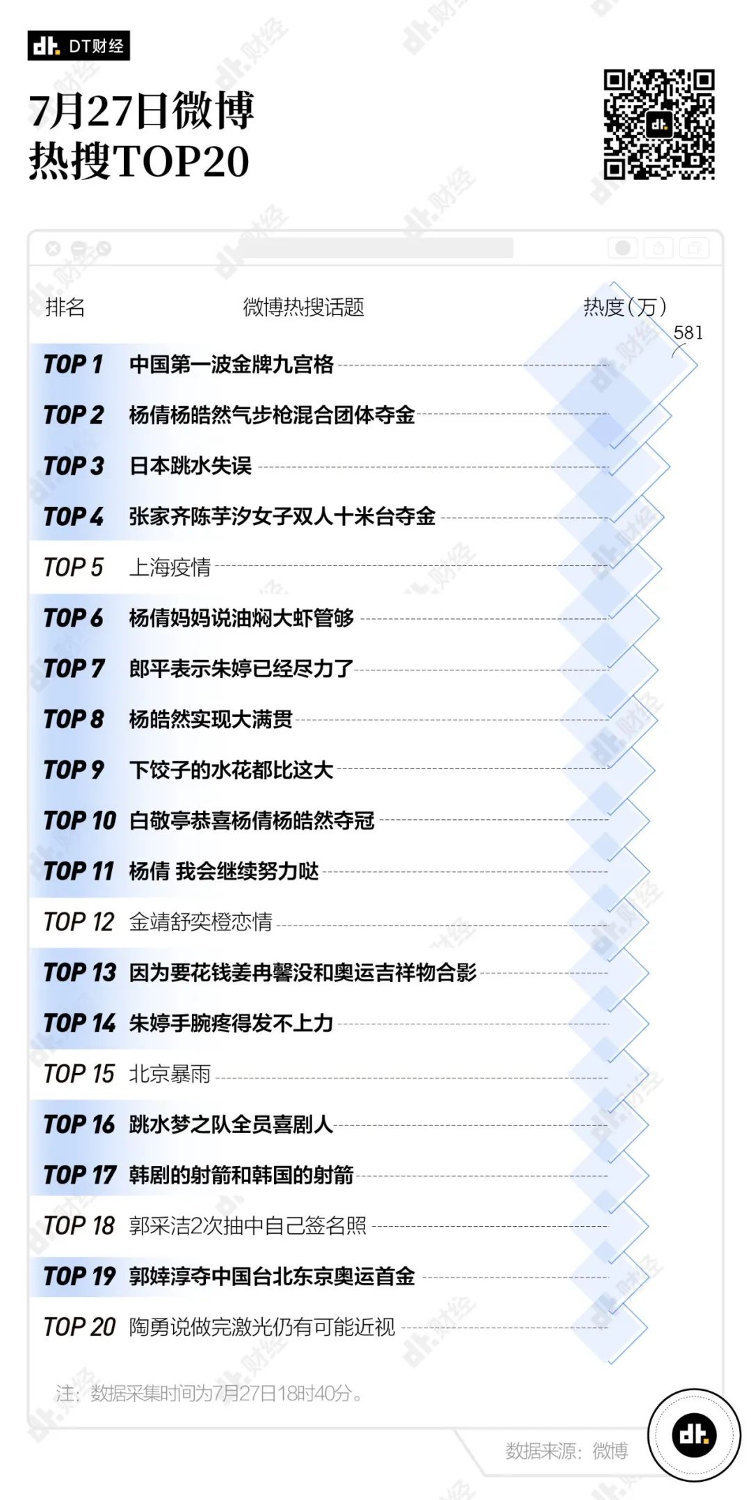 7月27日18點40分的微博熱搜榜上,TOP20的熱搜裏有15條與奧運有關,“含奧量”高達75%。
