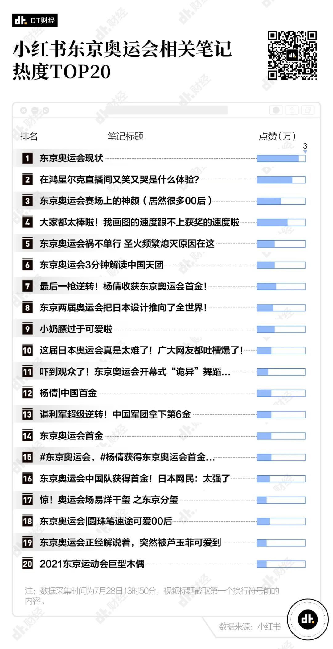 7月28日13時50分,我們在小紅書上搜索“東京奧運會”,並按熱度降序選出了目前為止熱度最高的20條相關筆記。