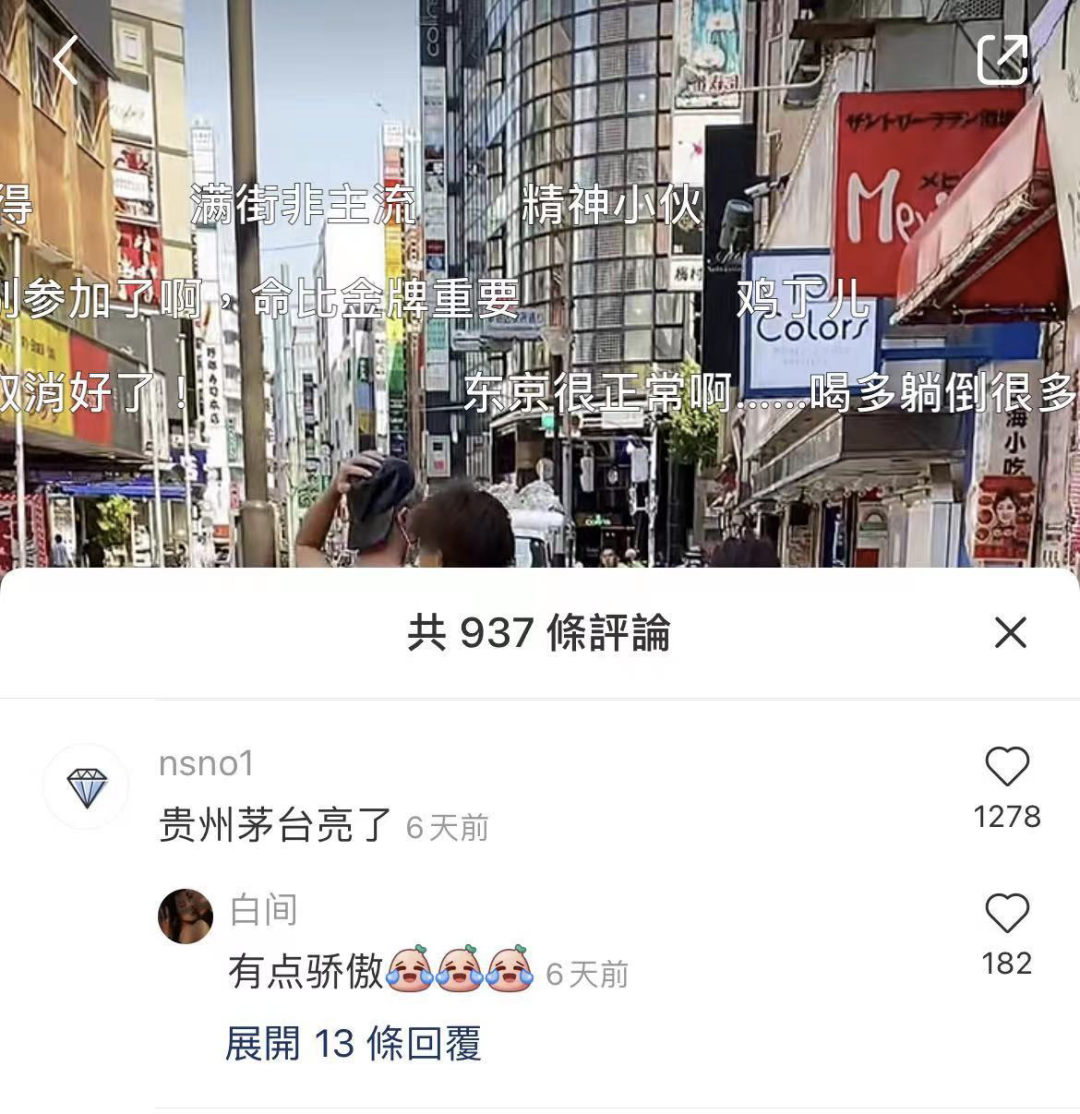 比如小紅書上最火的一條奧運筆記《東京奧運會現狀》。在日博主給大家拍攝東京街頭畫面、講解奧運相關事件時,不少人把關注點放在了視頻裏一張一閃而過的茅台廣告牌上。