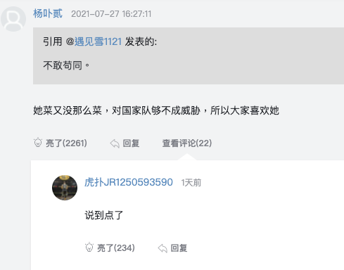 但虎撲討論體育的落點,不一定在於賽場本身。本屆比賽女足表現欠佳,但點開帖子,虎撲老哥對比賽的點評並不停留在比分層面,而討論足球基礎建設——“當歐洲開始重視女足,用那套早已成熟的市場體系來做女足基礎建設時,早晚吊打其他國家”。
