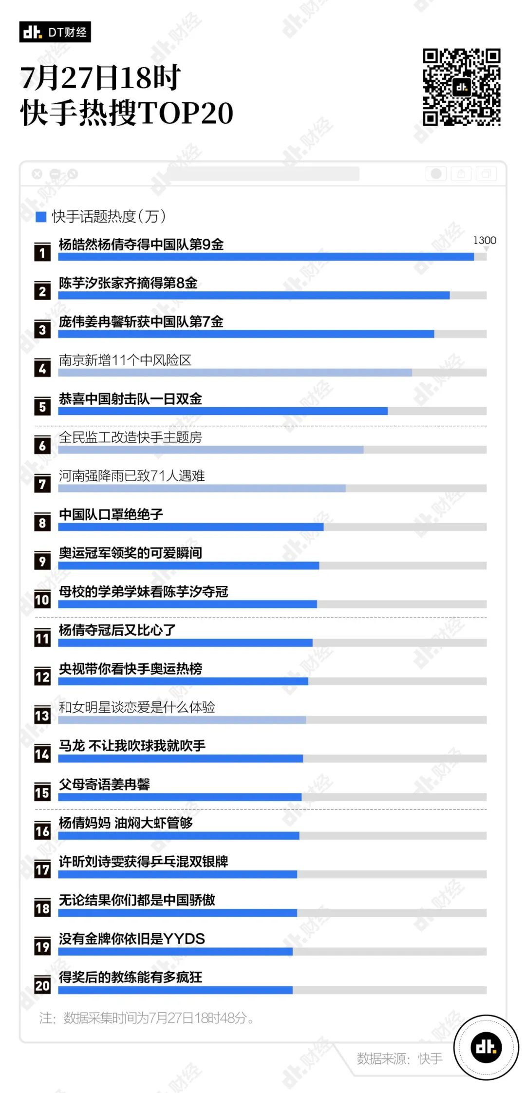 歡天喜地,如果你27日也在關注快手的話題榜,大概也會有這樣的感覺。7月27日18時48分,快手的TOP20的話題中有16條奧運內容,而且這16條內容中有多條奪冠後的慶祝信息,喜慶濃度直逼春晚。