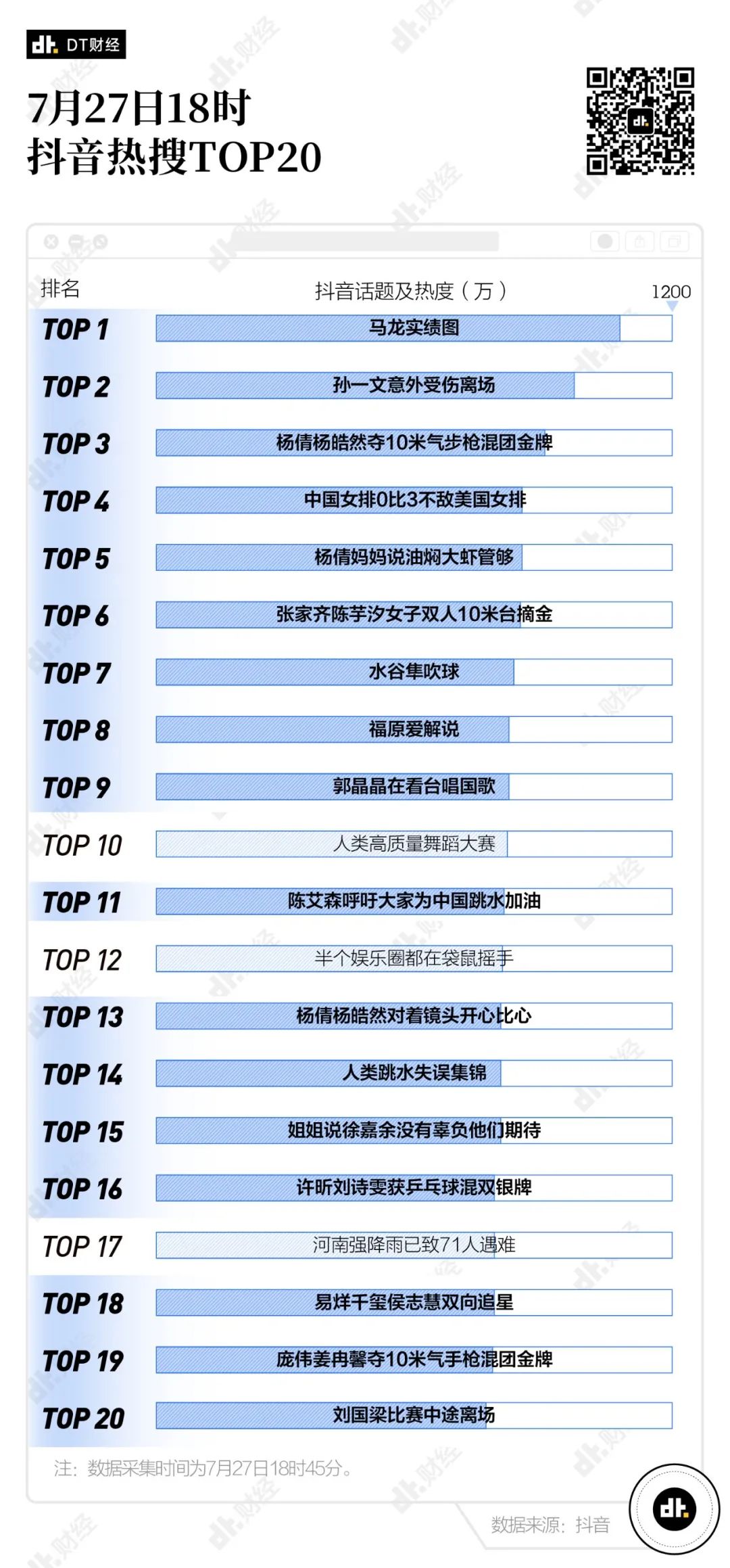 從7月27日晚間18時45分的抖音熱榜來看,抖音關注的奧運話題更多聚焦在個體。