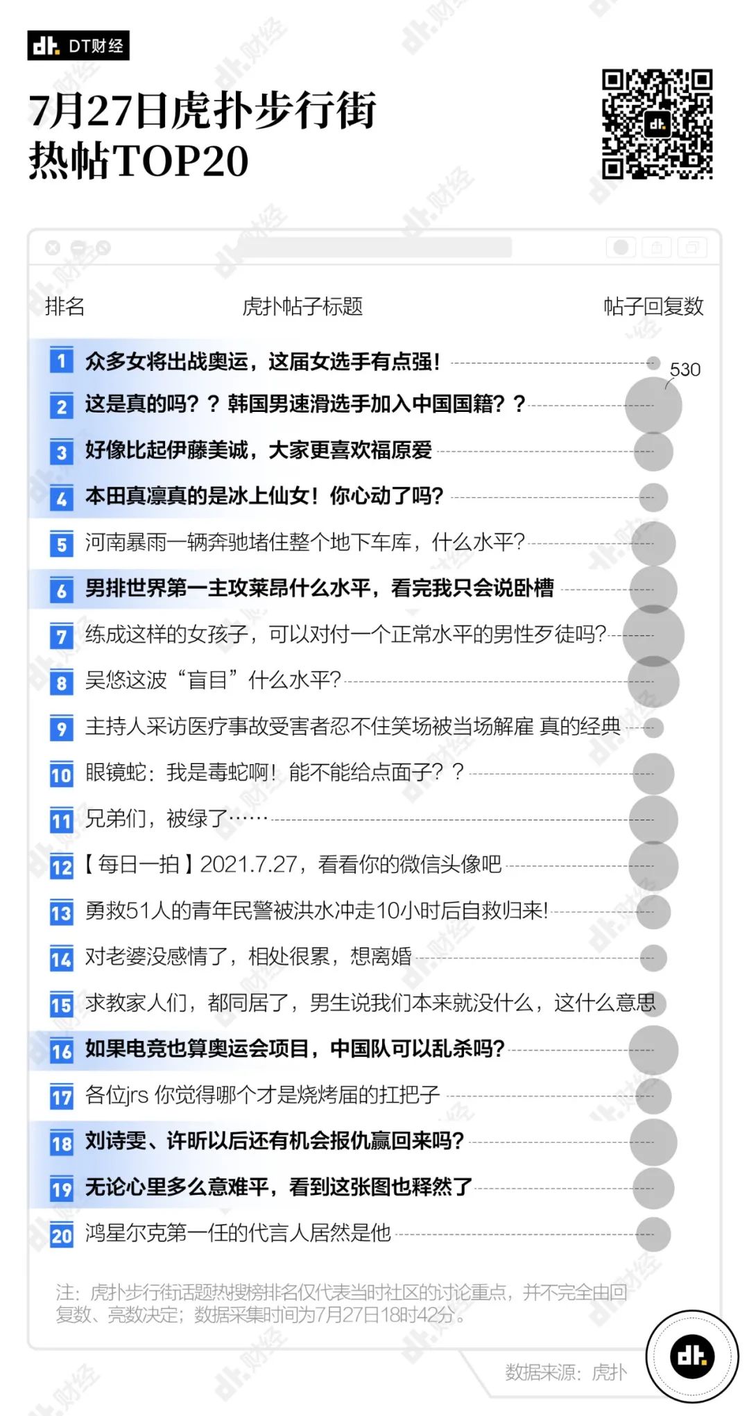 虎撲老哥對於體育的熱情是毋庸置疑的。7月27日晚19時的虎撲步行街熱點話題榜單就能看出這一點。當時步行街的TOP10熱點話題中,有一半與奧運相關。