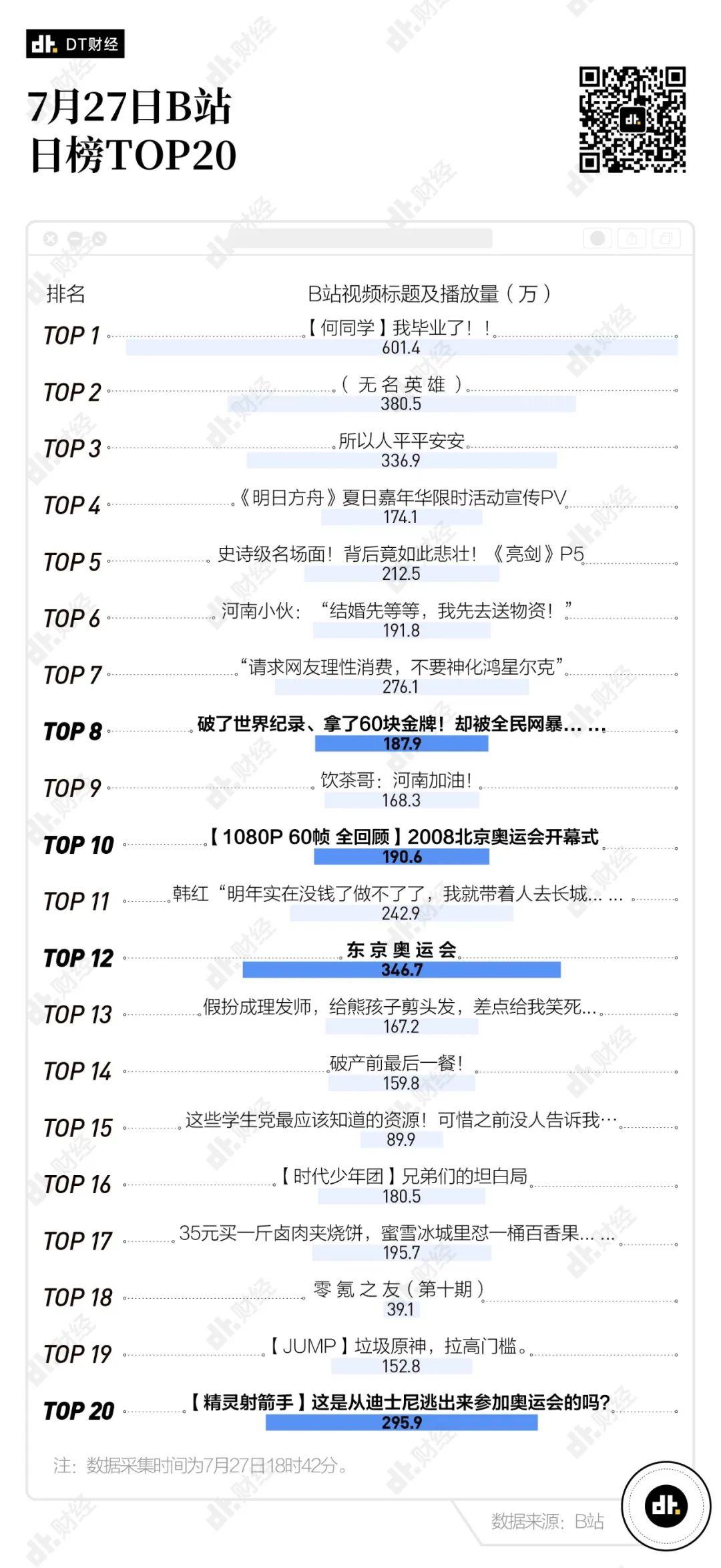 從7月27日晚間B站的熱榜內容來看,奧運會在B站的影響力不算太大,TOP20的內容當中只有4條與奧運相關,而且排名最高的一條也只排在第8位。