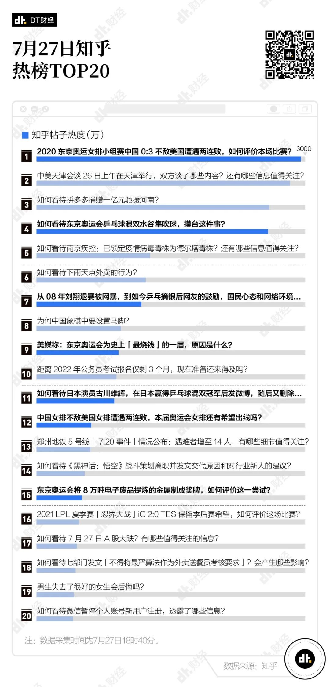 7月27日18時40分,我們在知乎逛了逛。當時知乎熱榜上的TOP20話題中有7條與奧運相關。