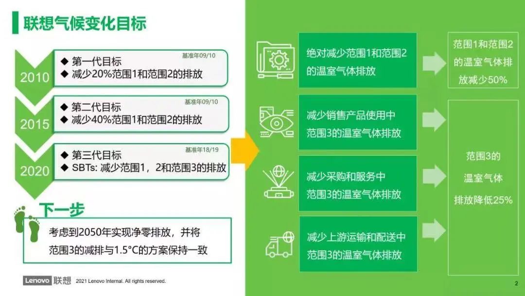 從2010年開始,聯想集團堅持在每年在自己的供應鏈大會上增加一個“碳排放”章節,向合作方介紹趨勢,鼓勵合作方提前做降低碳排放技術儲備。