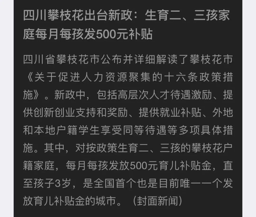 這幾天,朋友圈裏熱度比較高的除了疫情和抗災 ,還有兩條新聞,第一個是四川攀枝花出台新政:“生育二、三孩家庭每月每孩發500元補貼”,這是全國第一個發放育兒補貼金的城市。