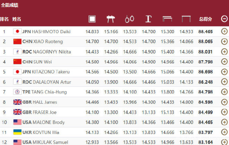 2021年7月28日,體操男子個人全能決賽,中國隊的兩名選手肖若騰和手腕受傷的孫煒衝擊金牌,最終肖若騰拿下銀牌,而孫煒獲得了第四名。這場比賽結束之後,外界引發了很大的爭議,主要是體現在肖若騰一度佔據領先的情況下丟金,而奪冠的橋本大輝一度有明顯失誤,但是打分卻給了高分,裁判引發巨大的爭議,甚至被稱為是奧運會歷史上最大的爭議和恥辱時刻。