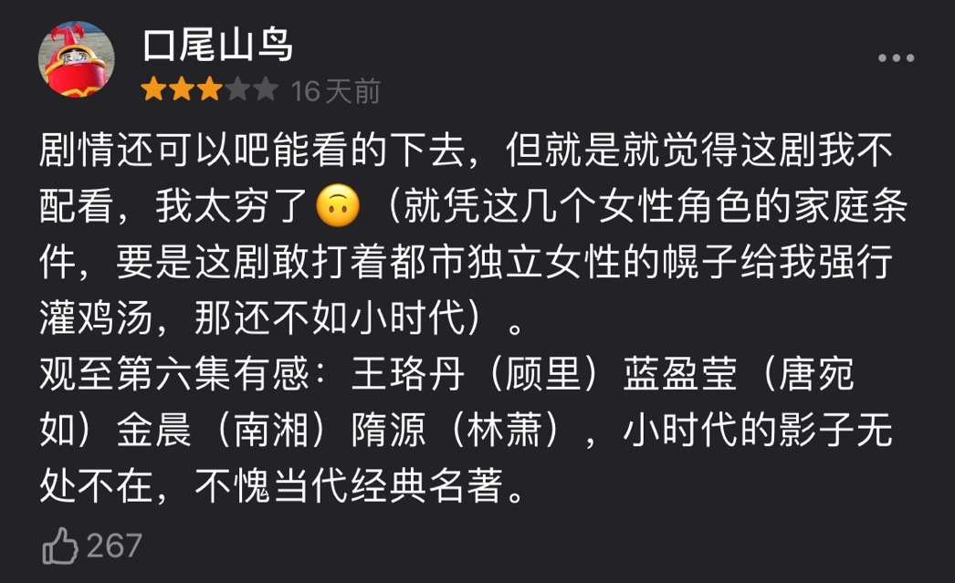 年輕人反感這部劇的原因是“懸浮感”——幾乎每個人都住在市區大平層、大別墅;幾乎每個人都在男人身上受過傷害,但姐妹間的愛就那麼堅貞不移,比如,跟陌生姐妹只見了兩面,就送名牌洗衣機的王珞丹;跟另一個陌生姐妹只見了一面,就要借錢給人家,一起合夥開餐廳的王珞丹;跟另一個陌生姐妹交往總時長不超過二十四小時,就能為人家掌摑渣男男友的王珞丹。