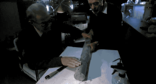 把大西洋底撈上來的表面的六邊形孔洞像切蛋糕一樣切開,就會看到下方泥土中完美的六邊形。動圖來源:Volcanoes of the Deep Sea(下同)