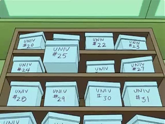 比如在《瑞克和莫蒂》中主要談及的平行世界和微縮宇宙,在《飛未》中也不止一次提到過了。第四季第十五集就是主要講述平行世界的:教授發現自己所在的宇宙就只裝在一個小小的白色紙盒子裏。