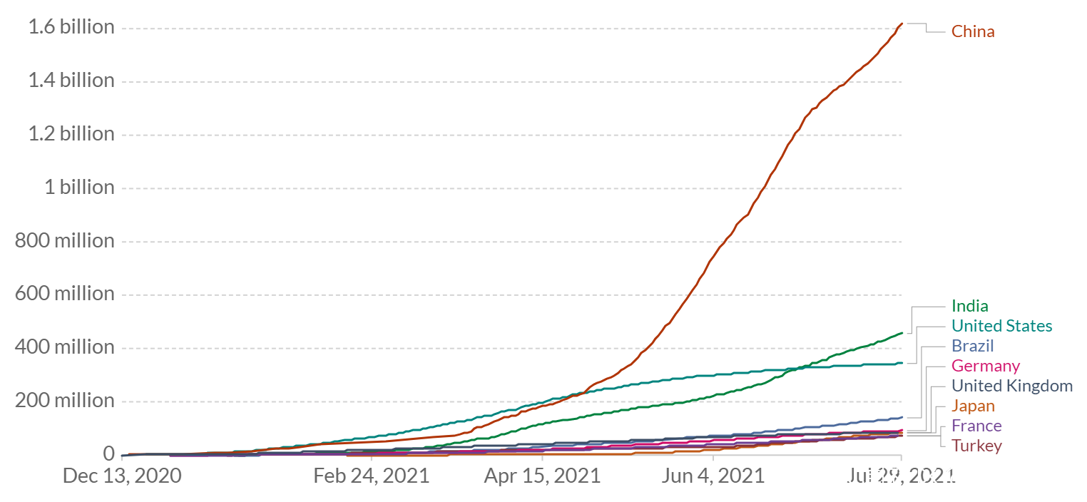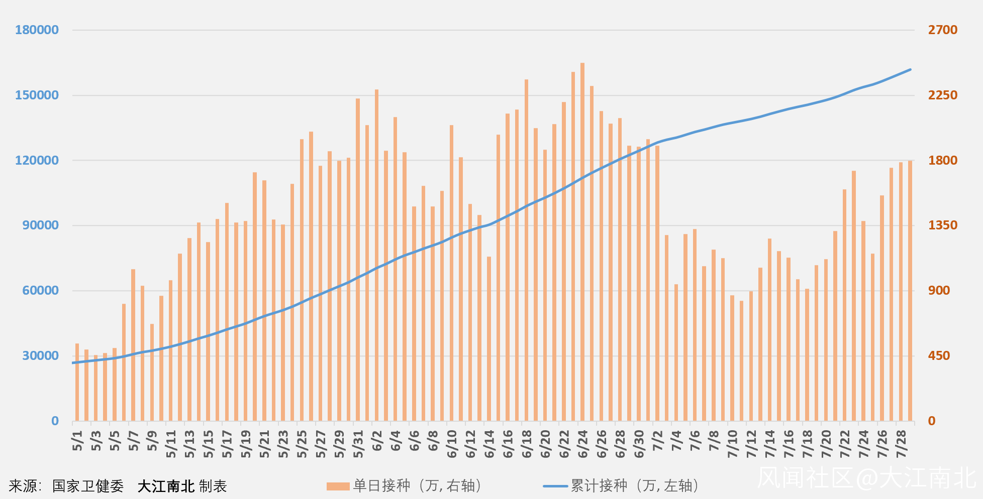 截止2021年7月29日,中國大陸累計接種新冠疫苗16.1922億劑,首次突破16億劑,繼續位居全球第一位,佔全球累計接種劑數的39.8%;其中單日新增接種1797****萬劑,受南京疫情影響,迅猛反彈,佔全球單日接種劑數的39.2%。中國每百人累計接種114.69劑,環比增加1.27劑,是美國的1.11倍,在世界主要大國中僅次於加拿大(每百人129.3劑)和英國(每百人124.5劑)。