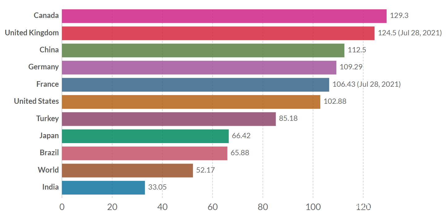 截止2021年7月29日,全球平均每百人接種52.17劑。