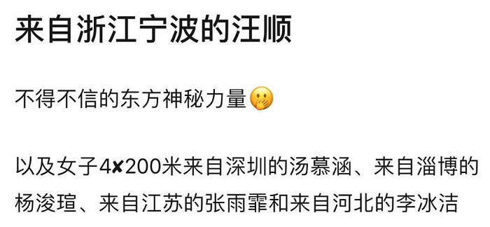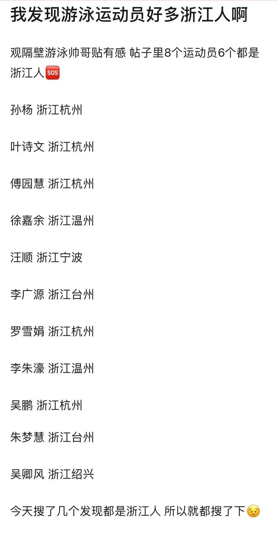 不單單是浙江,整個江浙滬一帶好像確實在游泳/跳水等等……和水相關的運動這塊出了不少運動員。