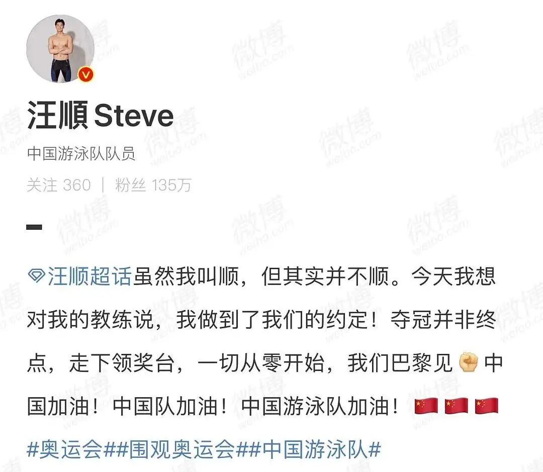 賽後接受採訪時,汪順説他做到了,讓國旗在東京飄揚,讓國歌在東京奏響!