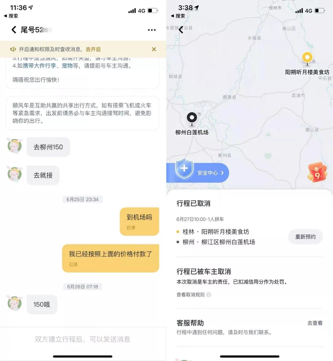 宋女士有關嘀嗒的噩夢,要從6月25日説起。當天上午,她預約了一輛6月27日上午從陽朔到柳州機場的嘀嗒順風車。預約好後,宋女士就接到車主的加價要求,車費從原來的108元加到150元。經過一番討價還價,最終雙方約定在120元的價格。