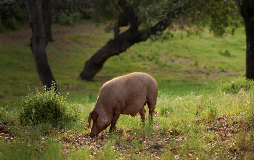 這個品牌火腿的每隻豬,都是100%血統的伊比利亞黑豬、每隻豬在西班牙哈布果德艾薩草場的活動範圍至少有10,000平方米、每隻豬每天都要走14公里、而且每頓,都是吃橡果的。