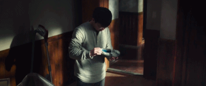 收音機突然放起了歡樂的音樂,藥師看見浴室磨砂裏的男人突然停下來跳起舞。