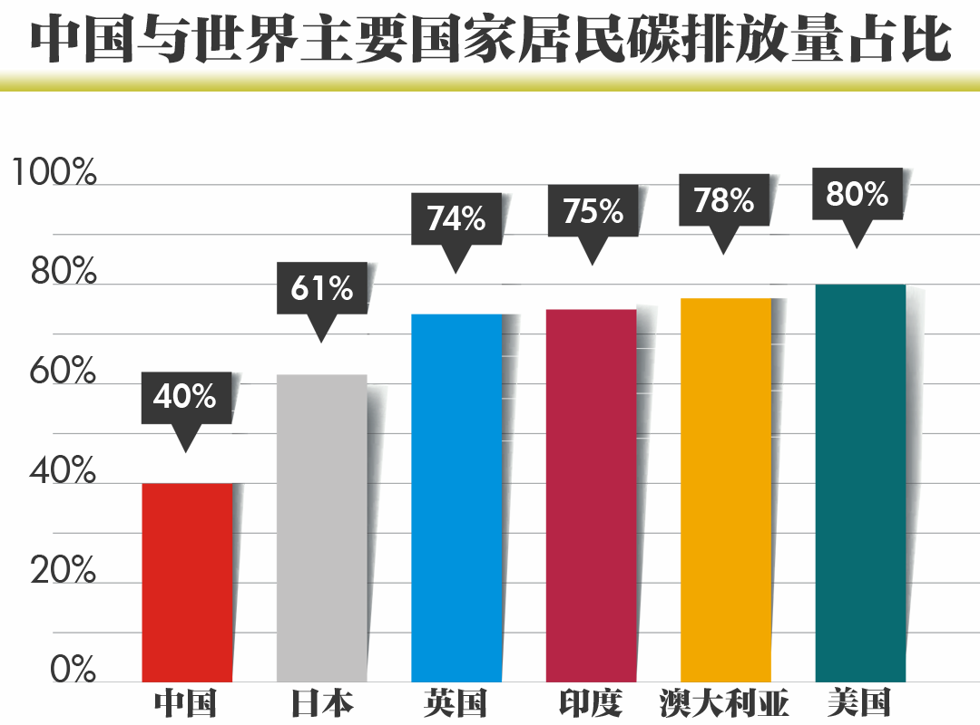 中金公司2017年研究顯示,發達國家居民生活碳排放量佔本國總排放量的60%—80%,而中國僅有40%,美國為中國的2倍。