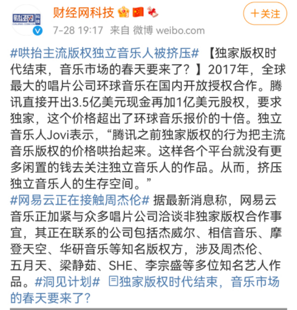 7月24日,國家市場監督管理總局對原有音樂版權授權模式進行調整,規定與獨立音樂人的獨家合作期限不得超過三年,與新歌首發的獨家合作期限不得超過三十日。