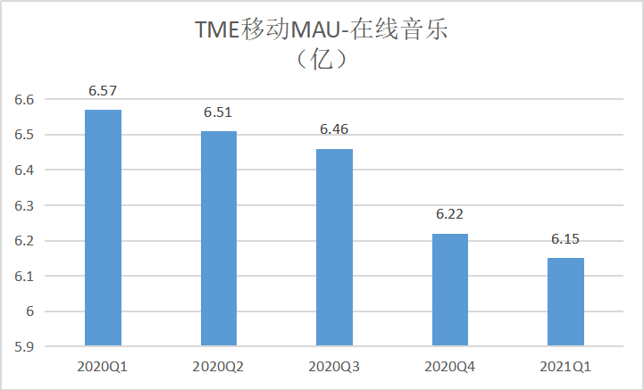 TME最新的Q1財報顯示,其在線音樂付費用户為6090萬,MAU為6.15億。這個數字看似碾壓網易雲,但與此同時,TME的MAU已經連續5個季度下降,2020Q1、2020Q2、2020Q3和2020Q4分別為6.57億、6.51億、6.46億和6.22。説明其月活增長已經進入天花板,在解除獨家版權之後,其他平台擴充用户的機會也將來臨。