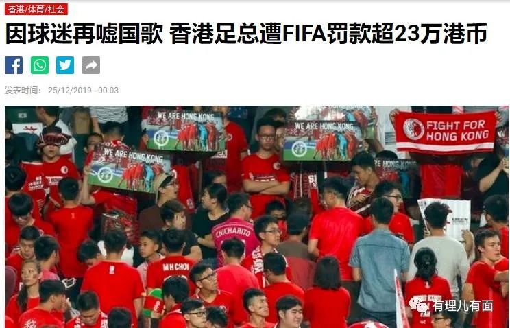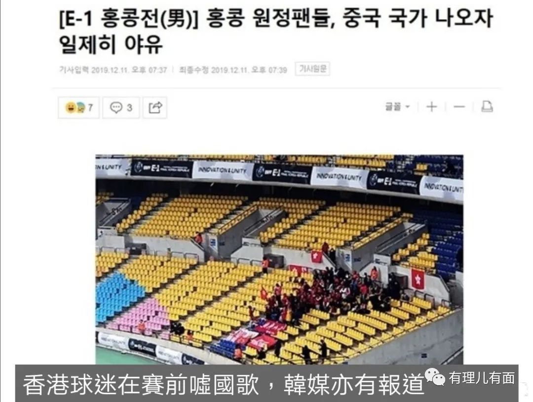 2019年12月,港隊客場對韓國隊,在釜山體育場上,港毒分子在播放義勇軍進行曲時“噓”國歌,並大喊“We are hongkong”口號,否認自己是中國人。該場比賽,港隊大敗之餘,韓國媒體也饒有興致的報道該事件,港毒們真是醜出國門。