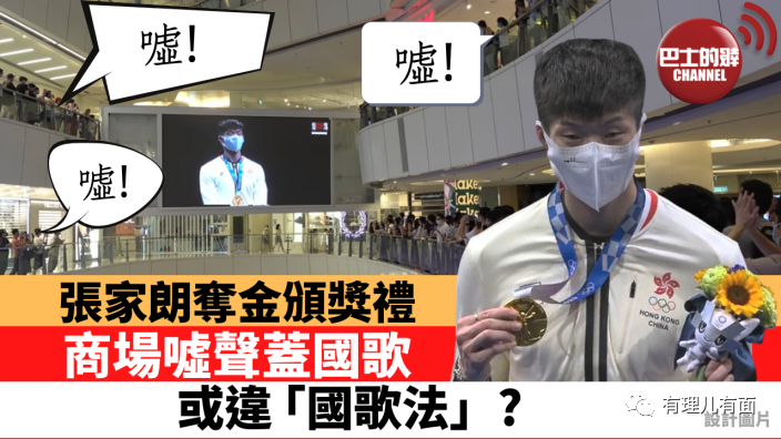 在奧委會向張家朗頒獎後,代表中國香港的紫荊區旗在義勇軍進行曲中徐徐升起。一些潛伏在人羣中的亂港分子開始帶頭髮出“噓”聲,並集體喊“We are hongkong”(我們是香港,暗示不是中國)的口號,以掩蓋國歌聲音,表達反中亂港的意思。