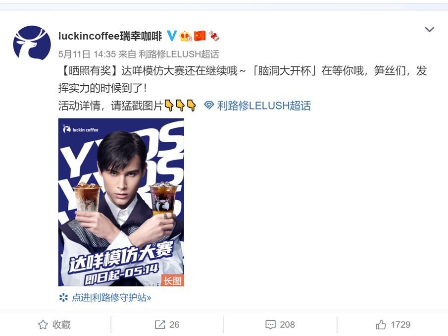 甚至,官宣新代言人利路修,也只是在官方的微博等渠道上,發佈了推文、海報和視頻。後續相應的活動,也只是號召消費者和利路修粉絲的模仿大賽。