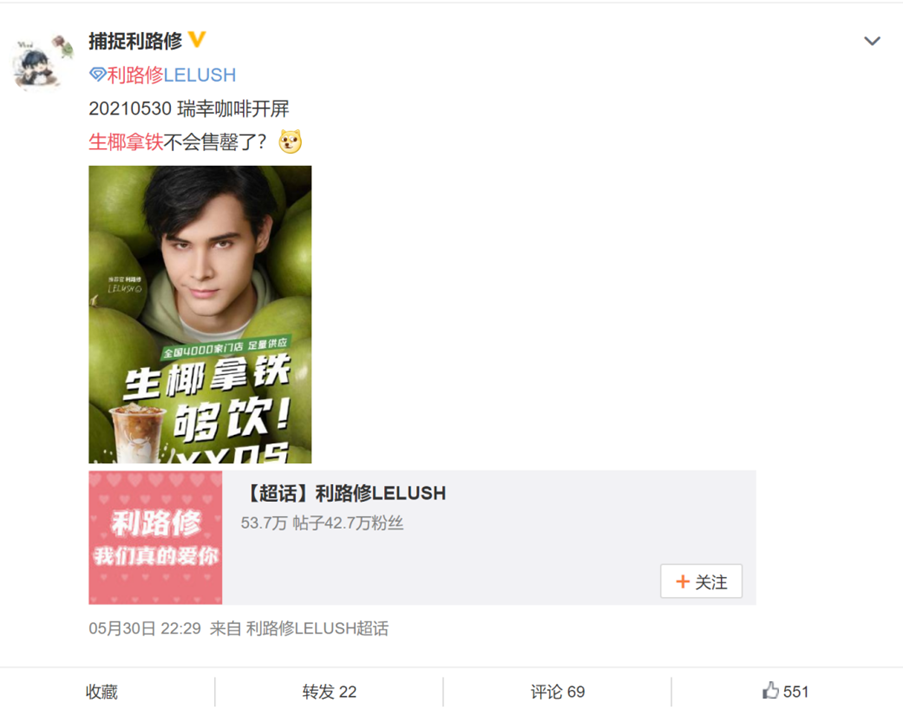 劉華的看法未必客觀,畢竟星巴克與瑞幸一直有舊怨。曾因“財務造假”跌入深淵的瑞幸咖啡,能頑強戰鬥至今已經是個奇蹟,這證明了其資本端雖然出現問題,資產端依然有一定價值。但是,曾經以刷屏營銷著稱的瑞幸,正變得安靜,增長開始轉向私域流量池,傳播主要依靠UGC。近期官宣新代言人利路修,也只是在官方雙微上發佈了海報和廣告,沒有其他大動作。