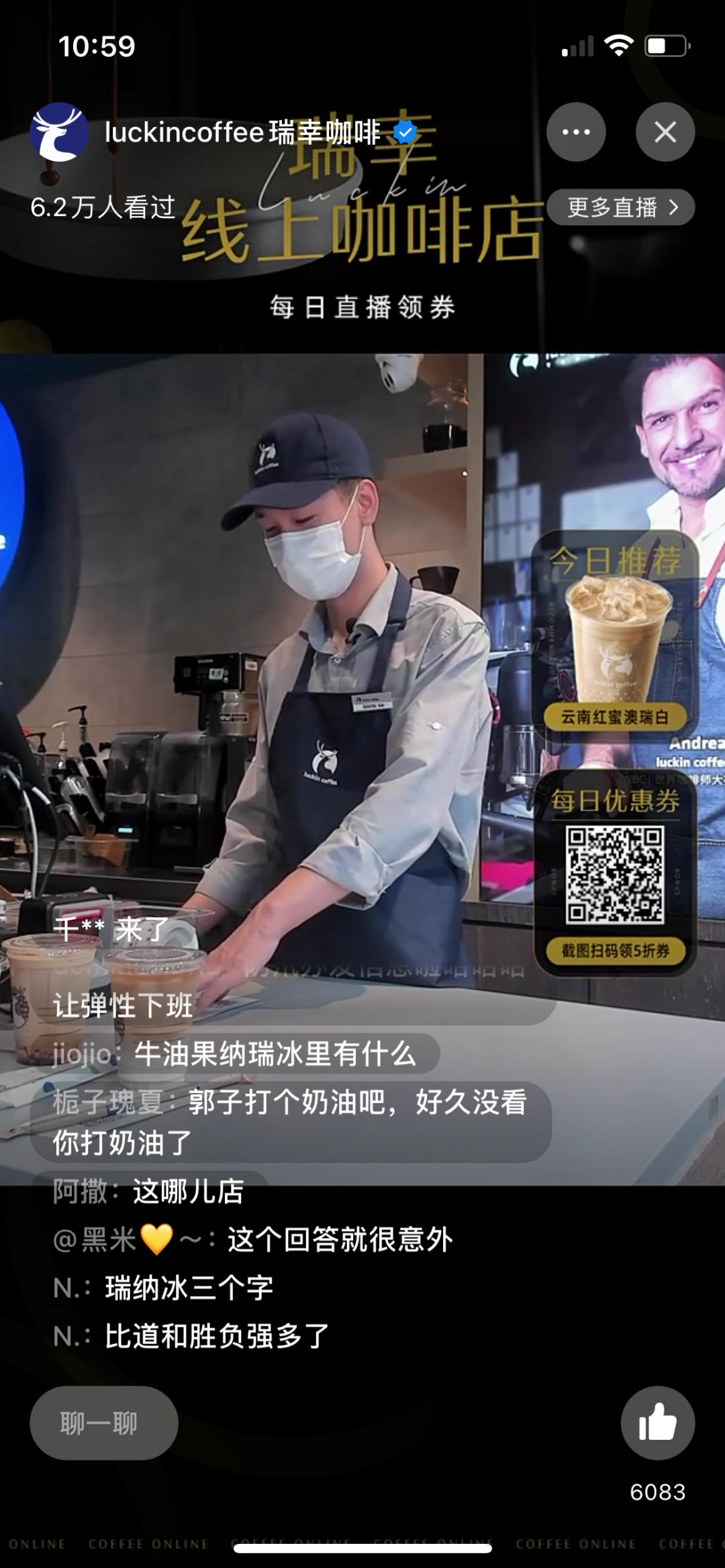 郭子經常一邊處理訂單,一邊招呼客人,時不時得和直播間裏的粉絲互動,回答相關問題。這是瑞幸咖啡官方視頻號的直播,買過或關注瑞幸公眾號的人,能看到這場直播的入口。