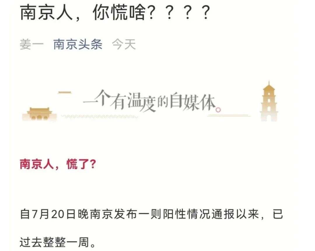 而且南京頭條昨晚還發布了一篇名為《南京人,你慌啥?? ??》的文章(現已刪除)。