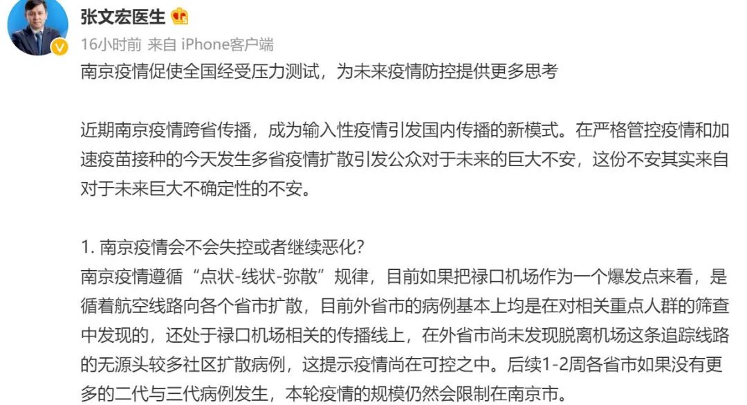 張文宏醫生昨天針對南京的疫情也發佈了文章,提到了這波南京疫情的規模,要看未來1-2周的監測,如果進一步出現了較多與祿口機場無直接相關的病例,則標誌着疫情規模會擴大,反之,則表示疫情尚在可控之中。